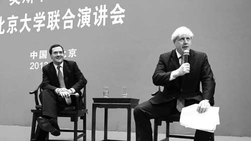 14日,伦敦市长约翰逊(右)和英国财政大臣奥斯本共同在北京大学发表演说,约翰逊从各个方面抢了奥斯本的风头,英国《金融时报》报道,当奥斯本说,他10岁的女儿教他认中国字时,约翰逊说:“我也有个女儿,她不仅在学中文,下周还要到中国来。怎么样?” |