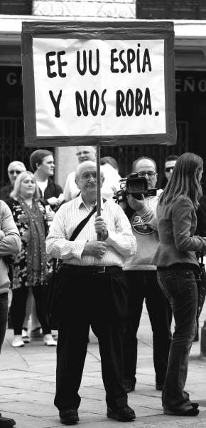 10月28日,西班牙马德里,美国驻西班牙大使科斯托斯离开西外交部,民众在门口抗议美国监听。西班牙媒体当天报道,美国国安局在2012年圣诞节前后的一个月内秘密监听西班牙6000万个电话记录。报道公布几个小时后,西班牙外交部召见美国驻西大使,要求做出解释。□本版图片来源 CFP |