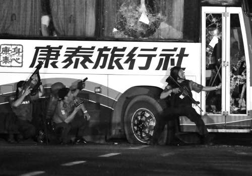 2010年8月23日,一辆载有25人(包括22名香港乘客)的旅游车在马尼拉被菲律宾前警察劫持,菲警方实施突击解救行动,香港乘客中8人死亡,6人受伤(资料图)。□本版图片来源 CFP |