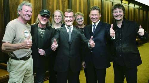 2011年,梅德韦杰夫(前排右三)和英国摇滚乐奠基者“深紫”乐队的成员在一起。 |