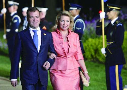 梅氏的夫人名叫斯维特拉娜,两人小学、初中、高中都在同一所学校念书,可谓青梅竹马、两小无猜。到了20多岁,俩人终于开始正式谈恋爱,并在梅德韦杰夫24岁时,有情人终成了眷属,他们的宝贝儿子伊尔亚今年已经18岁了。