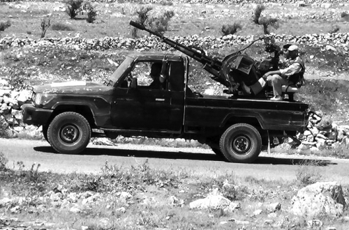 叙利亚国内冲突持续近3年,在铺天盖地的现场报道中,配置各式武器的皮卡车经常在摄像机面前招摇过市。它们的主人通常是叙利亚自由军(FSA)等反对派武装,有时也会出现在叙政府军的阵营里,因制造简单、使用方便、机动灵活而抢走了坦克、装甲车的风头。