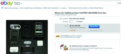 据eBay拍卖网站显示,一部未开封、无锁机8GB初代iPhone,叫价高达1399英镑(约合人民币13797元)。即使是二手iPhone 2G,在eBay也能卖出40~200英镑(约合人民币391~1955元),比市面回收价高得多。