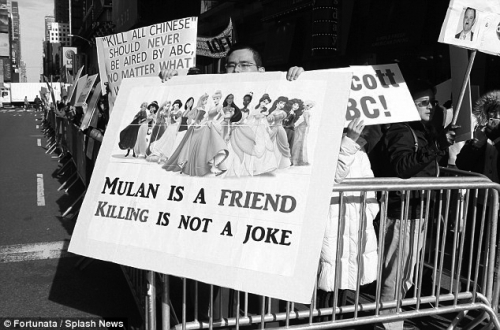 纽约一名华人男子的宣传板上印着迪士尼动画中的各路女主角,写着“花木兰是朋友,杀戮不是玩笑”。 |