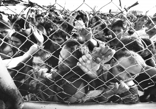 11月17日,菲律宾塔克洛班机场,台风“海燕”幸存者们拥挤在大门外,欲搭乘军机撤离。本版图片来源 CFP |