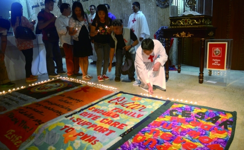 12月1日,菲律宾马尼拉,天主教教徒胸前佩戴红丝带出席世界艾滋病日弥撒活动。 |