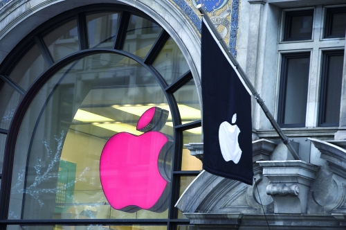伦敦摄政街的苹果旗舰店为迎接世界艾滋病日到来,将经典的苹果公司logo颜色换成了红色。 |