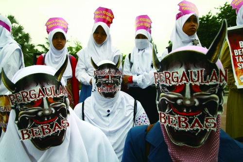 12月1日,印尼泗水,穆斯林女子扮作魔鬼纪念世界艾滋病日,抗议通过使用避孕套防治艾滋。她们认为避孕套的使用将增大社会上性行为年轻化的可能性。 |