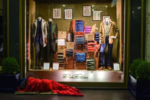 一位无家可归者睡在米兰一家高档服装店的橱窗外 |