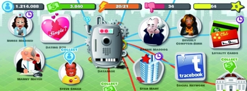 要是你对他人的健康数据感兴趣,可以去找Mildred——一个低薪困窘的护士,或是护士长模样的、比Mildred年长的护士Helen,当然价格也是水涨船高。在现实生活中,你可能只想偷窥别人的健康状况,但在游戏中,你得赚钱以获取更高的等级,玩更刺激的项目。高价将这些数据卖给对它们感兴趣的买主,你就赚大发了。如果你想倒卖其他高级信息,如他人的财产、业务、感情生活状况,就得请黑客或是侦探了,这要花费不菲的代价,但卖出的价钱也更高。正如游戏说明中建议的“做几桩大买卖,就能财源滚滚”。