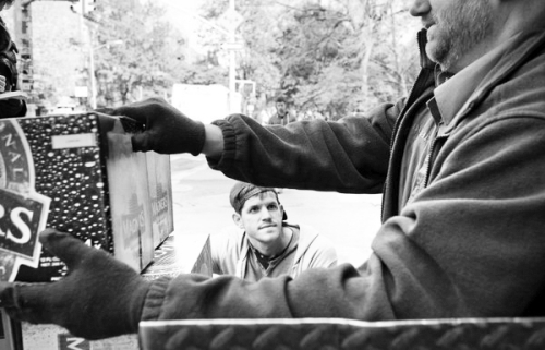 那个礼拜二早晨,斯坦顿在皇后区东村的人行道上寻找素材。他在纽约的每个行政区都留下了足迹,但更偏重于曼哈顿,因为那儿人流最密,街头生活也最丰富。他喜欢戴一顶棒球帽,把帽舌拉向背后,穿一件灰色连帽衫,脚下是新百伦休闲鞋,尽量让自己看起来随意些。需要跟陌生人交谈或为其拍照时,他往往会蹲下来,或直接坐在人行道上。他解释说:“这么做,都是为了尽可能让我看起来没有威胁,我降低嗓音,放低身段。”