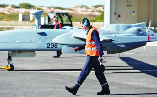 2011年12月,以色列帕尔玛希姆空军基地,一名工作人员从一架“苍鹭”无人机旁边走过。 |