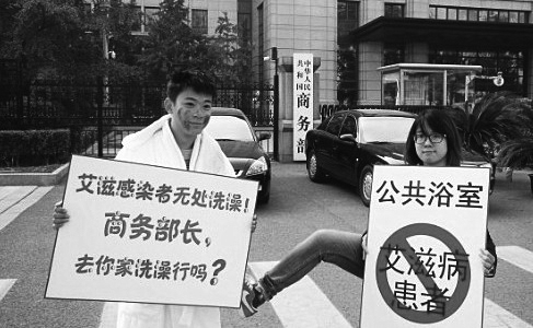 前不久,艾滋病毒携带者刘石(音)来到商务部大门口,身穿白色浴衣,手举“商务部长,去你家洗澡行吗?”的牌子,表示抗议。