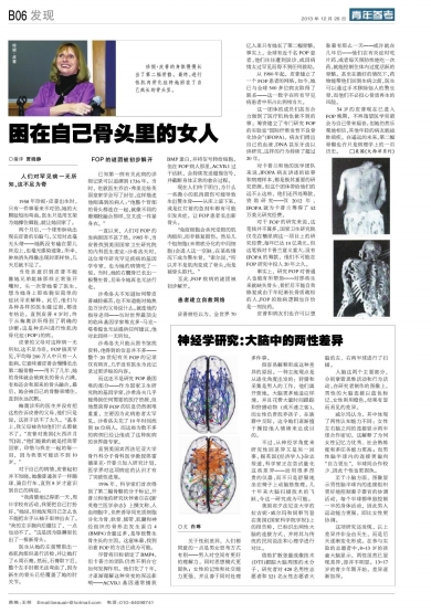 一直以来,人们对FOP的发病原因不甚了然。1985年,当皮普找到美国国家卫生研究院的内科医生麦克·沙希洛夫时,这位常年研究罕见疾病的基因学专家,也为她的病情吃了一惊。当时,她的右髋骨已长出一根赘生骨,后来令她再也无法行走。