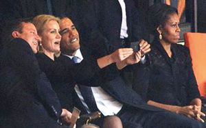 爱自拍 奥巴马、卡梅伦和丹麦女首相(左二)在曼德拉追悼会上玩自拍,而奥巴马妻子米歇尔在一旁脸色难看。 |