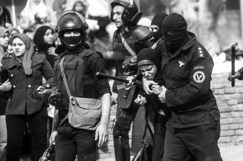 2013年12月30日,埃及开罗,防暴警察在艾资哈尔大学支持穆兄会的集会上抓捕一名女学生。 |