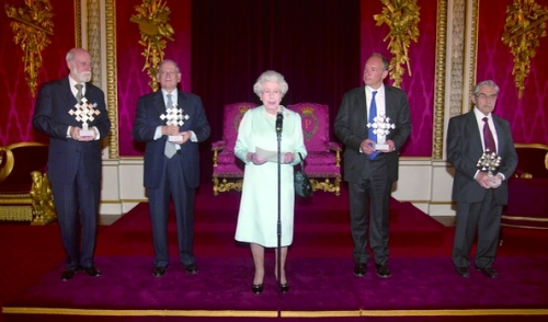 英国女王伊丽莎白二世为到场的四位互联网先驱颁奖,左起依次为温特·瑟夫、鲍勃·康恩、蒂姆·伯纳斯·李与路易斯·普赞 |