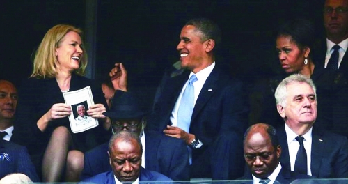 在2013年12月10日南非前总统曼德拉的追悼会上,52岁的奥巴马与46岁的丹麦女首相施密特,不但在看台上大玩亲密自拍,而且或公然调笑或窃窃私语,奥巴马还偶尔不经意地将手搭到女首相的肩膀上。眼见此景,坐在一旁的总统夫人米歇尔,眼睛里简直能喷出火来。网友调侃:“奥巴马回家后这一顿跪搓板,肯定是逃不了了。”