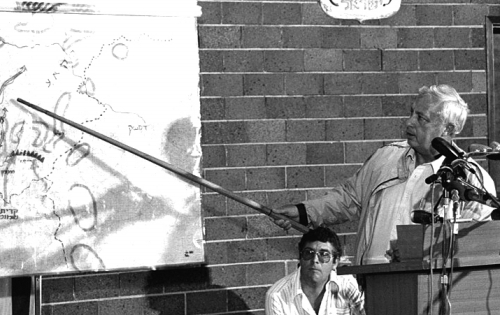 1982年6月11日,时任国防部长的沙龙在特拉维夫指着黎巴嫩地图发表讲话。 |