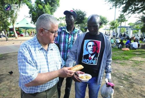 近年来,非洲避难者与以色列人的摩擦时有发生,但仍有很多以色列人对非洲避难者持同情态度。图为一名以色列男子在向非洲避难者提供食物。 |