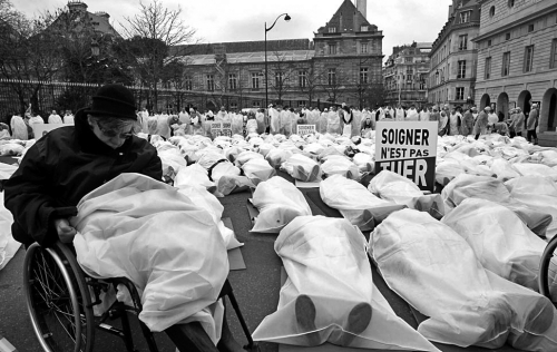 2011年1月,人们扮成尸体,在法国参议院外抗议安乐死合法化。 |