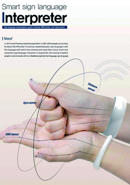 对于听力有障碍的人来说,手势是他们最重要的交流语言,但要同普通人说话交流,就要考虑对方能否看懂这些手势了。这款概念手环通过若干感应器来探测手指的位置、力度,并将所表达的含义转换成语言播放出来;而对方说的话经过翻译之后,也会以手势图案的方式显示在手环的小屏幕上,从而实现人与人的无障碍沟通。