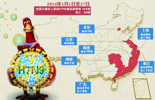 2014年1月28日,中国官方发布的数据显示,从1月1日至27日,中国已确诊的人感染H7N9禽流感病例为102例,其中死亡20例,发病数已接近去年高峰水平。《今日美国》报称,高致命性禽流感再度侵袭中国。