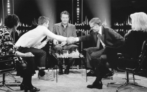 在挪威国家广播电视台NRK的一档节目中,微软公司创始人比尔·盖茨向卡尔森发起挑战,扬言要与他在棋桌上“一见高下”。为保公平,这场棋赛还特别设定了倾斜规则,即每步棋盖茨有2分钟时间思考,卡尔森则只有30秒。然而,即使在这样的规则下,盖茨仍没能占到任何先机——卡尔森只花了79秒、共计9步,便将传说中IQ高达160的世界首富“秒杀”。