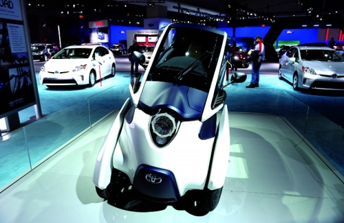 当地时间1月27日,2014年华盛顿汽车展在美国华盛顿展览中心举行,“绿色”技术持续成为本届车展的主题和最大亮点(图为丰田新能源车展台)。