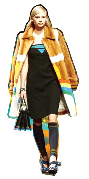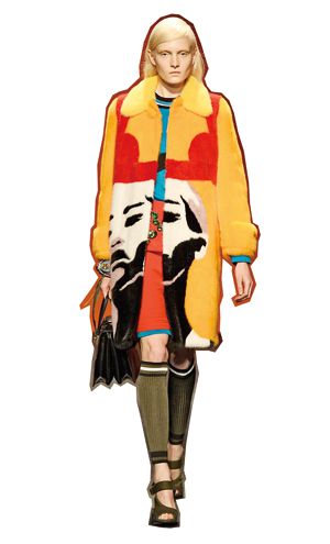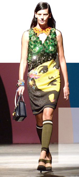 通常,设计师会通过与艺术家合作的方式,将艺术直接嫁接到时装上来。在这一点上,没人比缪西娅·普拉达 (Miuccia Prada)女士更加高调——她邀请了6位当代艺术家为普拉达 (Prada)进行创作。这6幅风格不同、色彩浓郁的波普风格女性肖像画不仅出现在该品牌2014春夏系列服装上,也在包袋、鞋履系列中亮相。普拉达热烈招摇的设计带给观众别样的视觉体验,不过,也有人对这些印花服装的实用性表示怀疑——究竟什么人会把它穿在身上?
