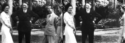 戈培尔因狂热的精神、超群的思想和激烈的反犹太主义而受到希特勒的重视。希特勒任命戈培尔为宣传部长,派遣他到德国各地建立纳粹势力,并在战争中鼓舞士气。与斯大林相似,希特勒也试图“擦除”一些人的存在。我们现在仍不知道戈培尔做过些什么,导致他从这张于1937年,在德国电影制片人雷妮·里芬斯塔尔家中拍摄的著名照片中被删除。