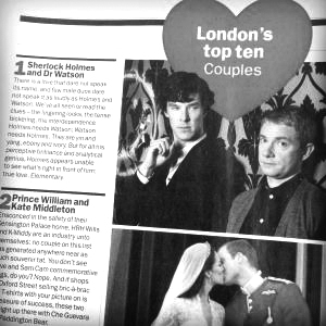 英国知名杂志《Time Out》近日评选出十大最令人印象深刻的伦敦情侣。第一名由英国广播公司(BBC)播出的《新世纪福尔摩斯》版福尔摩斯和他的得力助手华生爆冷夺得,而一向被视为英伦情侣代表的威廉王子和凯特王妃只能屈居第二。