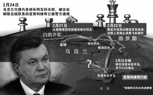 23日,亚努科维奇抵达克里米亚,放弃了保卫安全的随从,仅带着一二亲信开车到未知位置,然后关闭了所有形式的沟通渠道,自此杳无音讯。“亚努科维奇已经消失了。”代理内政部长阿瓦科夫告诉美国广播公司。