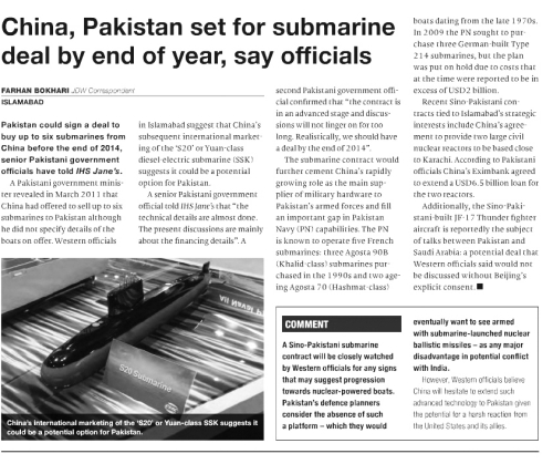 2月中旬,英国《简氏防务周刊》首次披露,中国向巴基斯坦海军出售6艘先进潜艇的合同有望于年内签署。尽管相关细节尚未公开,西方军事专家判断,中国售巴潜艇应该是最新式的“元”级柴电潜艇,有助于缩小巴基斯坦海军与主要对手印度在水下力量上的差距。