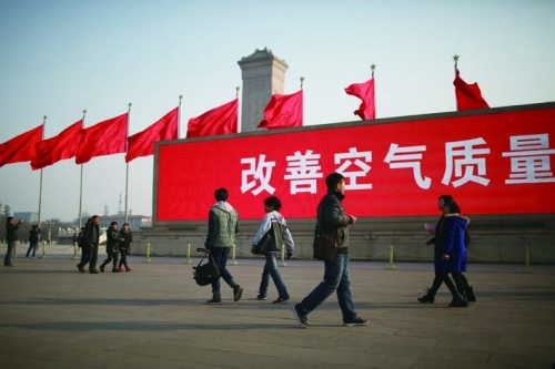3月2日,北京,两会前夕,天安门广场上的巨幅LED广告牌打出了主题为“改善空气质量”的标语。法国新闻社(AFP) |