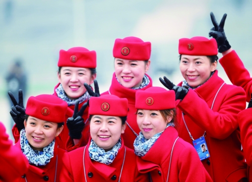 3月3日,一群负责人员疏导工作的礼仪小姐在人民大会堂前合影留念。法国新闻社(AFP) |