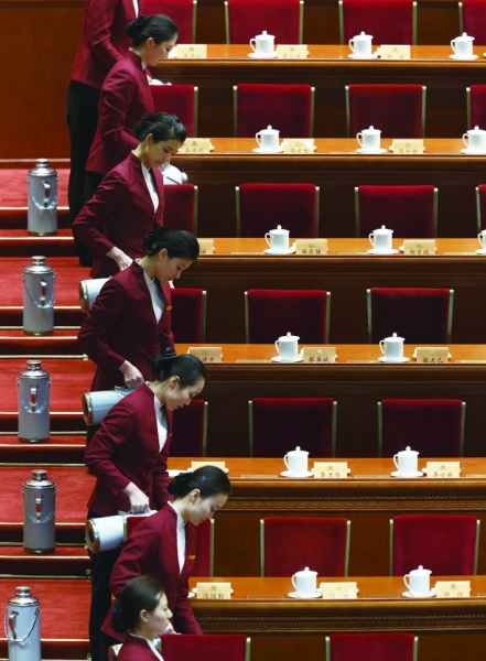3月3日,北京,礼仪小姐为即将入场的委员泡茶。欧洲新闻图片社(EPA) |