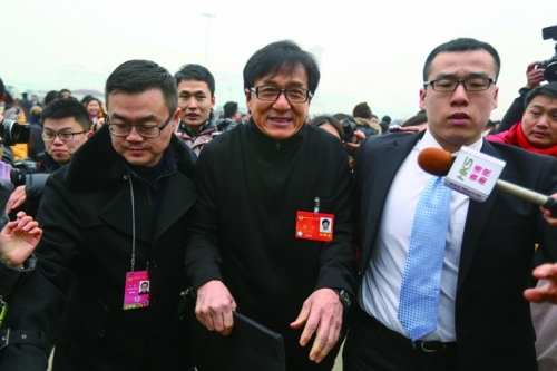 3月3日,北京,香港影星成龙在一众记者的簇拥下步入会场。欧洲新闻图片社(EPA) |