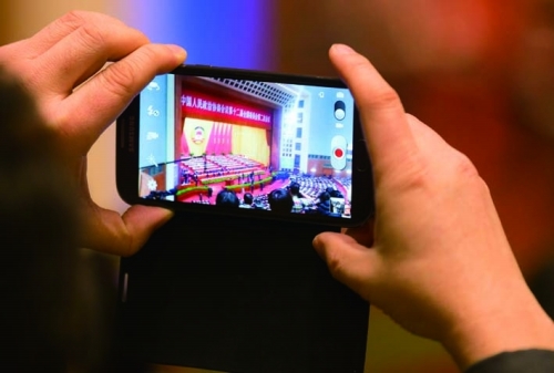 3月3日,北京,一名委员在会议开始前拿出手机,拍下会场全貌。欧洲新闻图片社(EPA) |