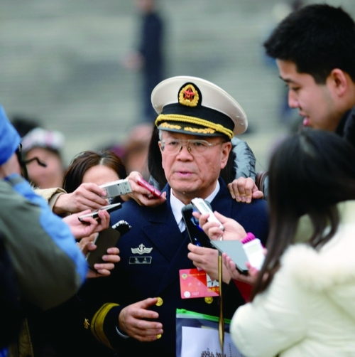3月3日,北京,军事专家尹卓少将在会场外回答记者提问。法国新闻社(AFP) |