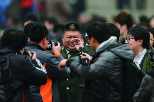 3月3日,北京,全国政协十二届二次会议开幕式即将开始,毛新宇在会场外被记者包围。华盖创意(Getty) |