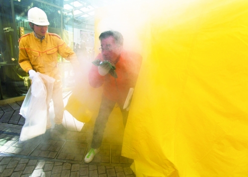 3月11日,日本东京,3·11大地震3周年之际,日本组织地震逃生自救模拟演练。