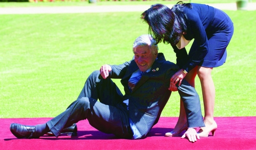 2014年3月11日,智利维尼亚德尔马,荷兰前首相吕贝尔斯抵达总统府出席午宴时,在红毯上不慎摔倒。吕贝尔斯此行是为了出席智利总统米歇尔·巴切莱特的就职仪式。 当天,再度成功胜选智利总统的女强人巴切莱特,开始了她的第二届任期。巴切莱特是南美历史上第一位民选女总统。2006年1月15日,她作为智利执政联盟总统候选人参加大选并获胜,成为智利历史上首位女总统。同年3月11日,她宣誓就职,任期4年。2008年4月,她对中国进行国事访问,并出席博鳌亚洲论坛2008年年会。2013年12月15日,她再次当选总统。 |