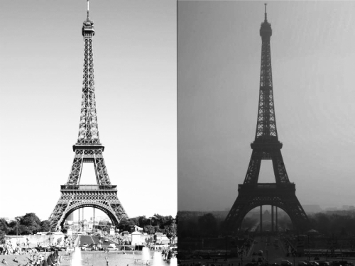 与往日相比,3月17日的埃菲尔铁塔(下)几近“消失”。 |