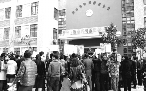 西安的两家幼儿园在被曝出给孩子“乱喂药”后,已经关门。图为愤怒的家长聚集在幼儿园门前,表示抗议。