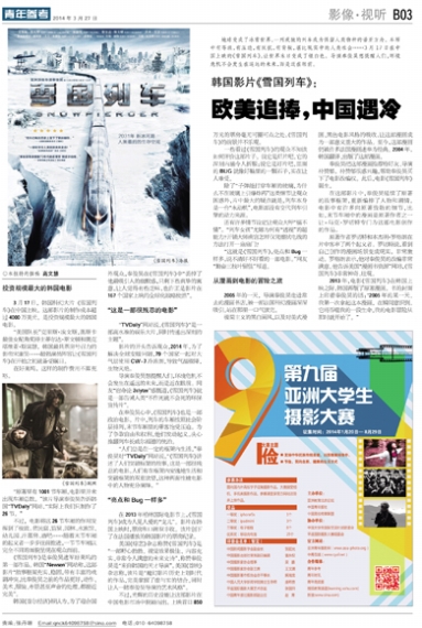 3月17日,韩国科幻大片《雪国列车》在中国上映。这部影片的制作成本超过4000万美元,是投资规模最大的韩国电影。