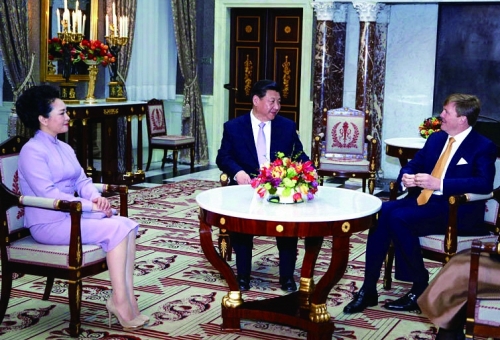 3月22日,在与荷兰国王亲切交谈时,习近平主席打了条淡紫色领带,恰与彭丽媛的套装颜色一致。 |