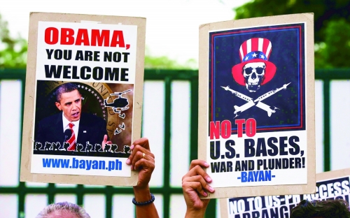 3月24日,菲律宾奎松,菲民众在军事基地外集会,抗议美国总统奥巴马访问菲律宾。当天,美国与菲律宾就使用菲方军事基地问题进行了第七轮协商。