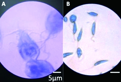 纸质显微镜观察到的贾第鞭毛虫(左)和利什曼原虫(右)。 |