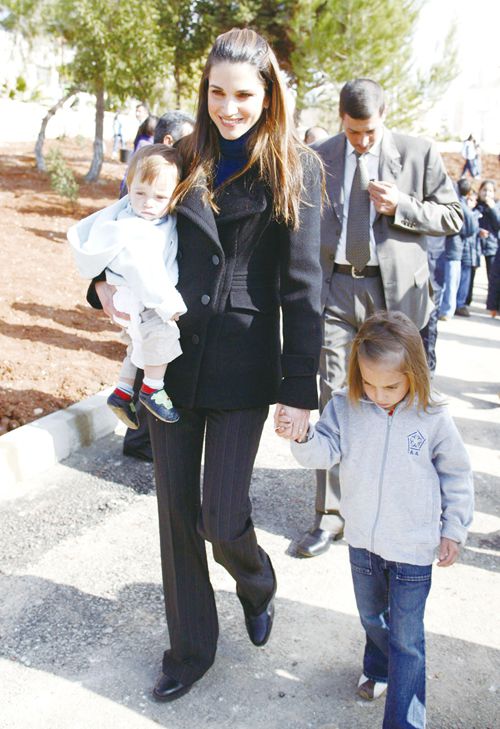 2005年12月19日,约旦安曼,约旦王后瑞尼亚带着儿子赫许小王子和女儿萨尔玛公主参加了纪念安曼宾馆爆炸遇害者的植树仪式。 |